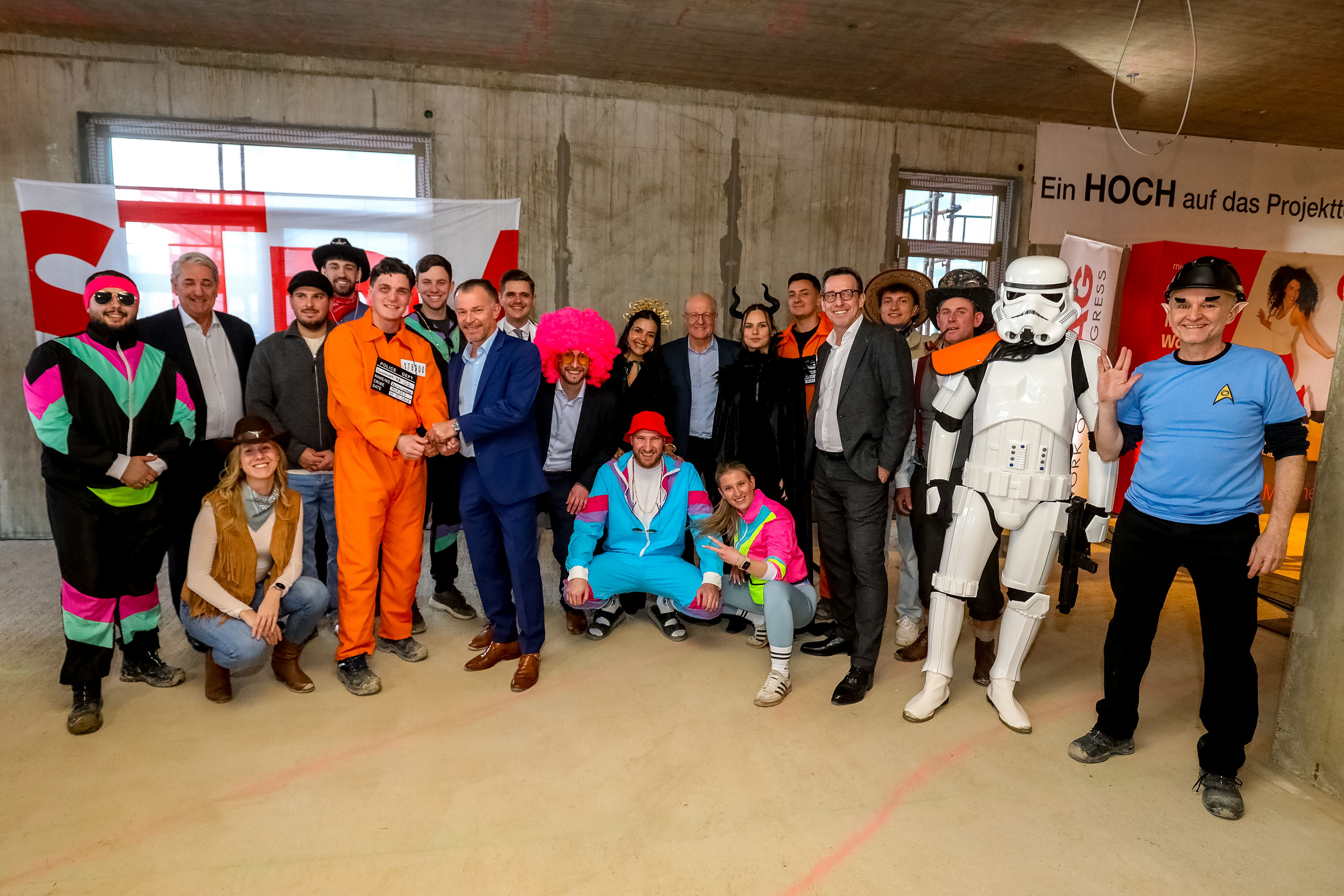 „Gelber Hof“, „Hellblauer Hof“ und „Hof am Park“ – die neuen Mischek-Quartiersteile erstrahlen zumindest vom Namen her in allen Farben. Äußerlich werden sie sich harmonisch ins Ensemble des neuen Stadterweiterungsgebiets „Oberes Hausfeld“ einfügen. Dafür ging es bei der Gleichenfeier am Faschingsdienstag ungewöhnlich farbenfroh zu.